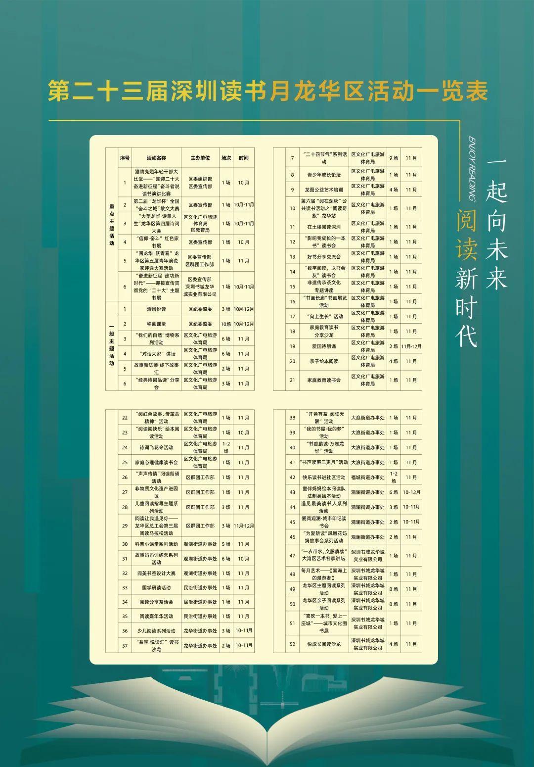 本届读书月龙华区将围绕“阅读新时代 一起向未来”主题,突出“奋斗文化”精神内核,集中推出近150场主题活动,积极促进全民阅读纵深发展,进一步增强市民的参与度,掀起全城共读热潮。
