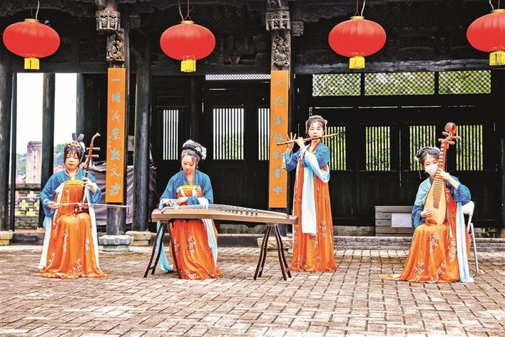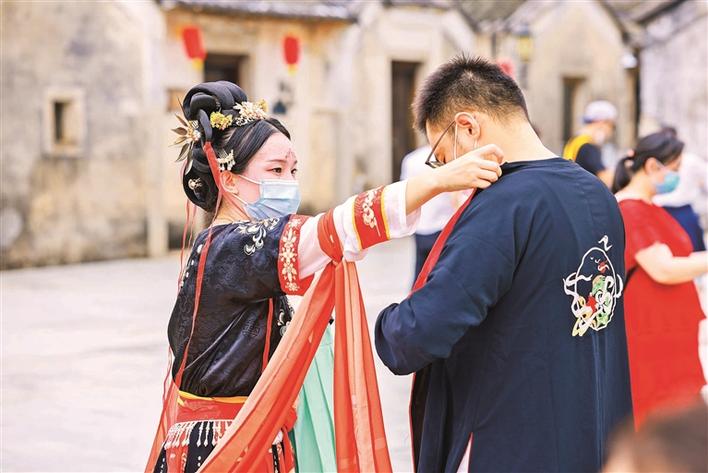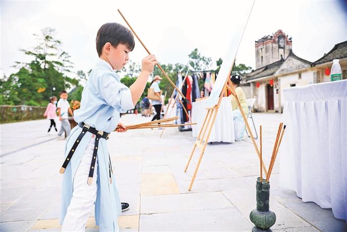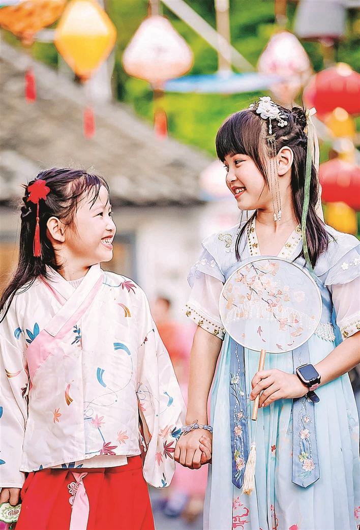 小朋友们穿上华丽的汉服在上围艺术村打卡。