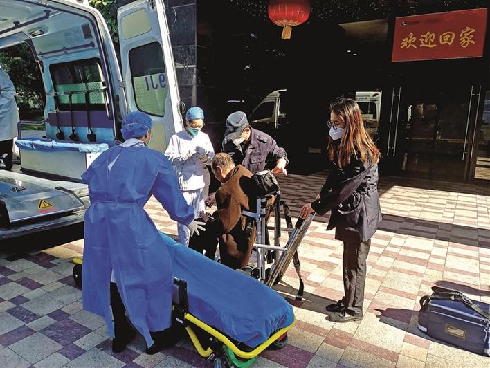 福城街道四和社区网格员协助医护把老人送上救护车。