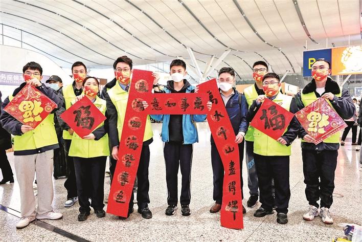 深圳北站候车厅内,旅客与车站工作人员拿着春联和福字合影。