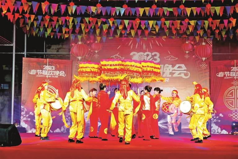 当晚7点半,港口村戏台前已是人山人海,晚会在欢快的腰鼓舞《开门红》中拉开帷幕,伞子舞、独唱、闽南语情景剧、民族舞、现代舞、印度舞、中国古典乐器演奏等二十多个节目轮番上演,优美的舞蹈、动听的歌声和接地气的表演,让乡亲们感受到浓浓的年味,博得现场观众的阵阵喝彩。除了本村村民自编自演的节目外,附近村庄也送来了腰鼓舞、民族舞、健身操等精彩表演,为这场乡村春晚增色不少。