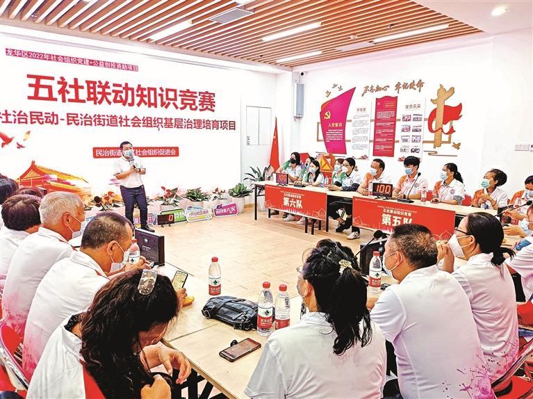 2022年,龙华区民政局创新推出社区与社会组织、社会工作者、社区志愿者、社会慈善资源“五社”联动服务基层群众新模式。“五社联动”充分发挥社会组织党委、社区党委等党组织强大组织能力和动员能力,将各方资源力量有机融合为一个“作战整体”,以系统合力精准回应居民多样化需求。在“战疫优服务 齐心做表率”活动中,“五社”精准高效联结,累计动员70余家爱心企业捐款捐物近500万元,发动198家社会组织开展志愿服务逾8.7万人次。
