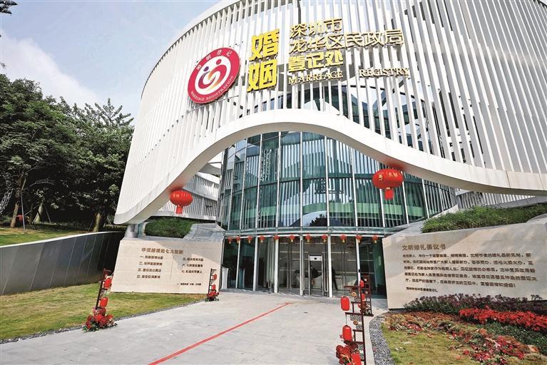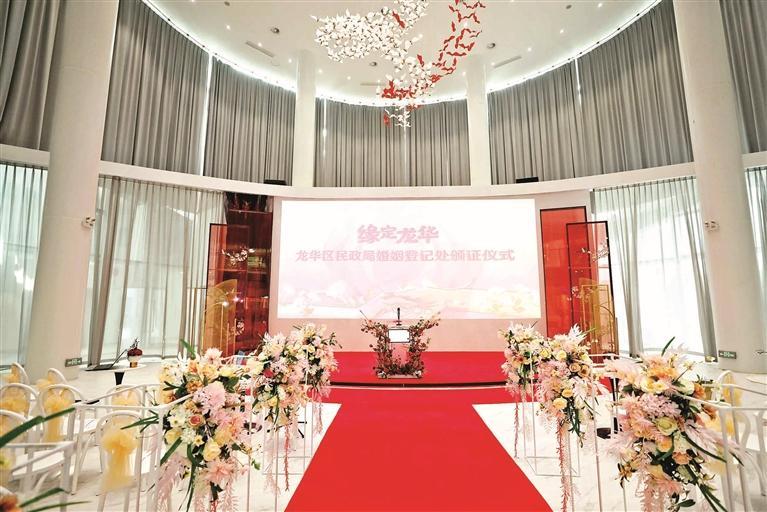 婚姻登记服务,也是区民政局推进数字化改革的重点领域。婚姻登记处成立之初就在全国首创3D数字映像模拟场景颁证厅,2021年9月启用民法公园新馆更是配备“5G全息投影”颁证台、科技感十足的婚俗云馆。2022年,区民政局创新打造龙华婚姻文化体验馆,持续推进新时代婚姻家庭文化建设,把新址打造为集智能化、人性化、个性化于一体,富有龙华特色的网红“打卡点”。去年龙华区入选第二批全省婚俗改革试验区。