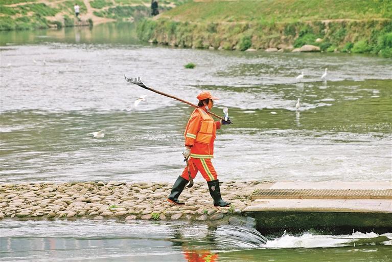 环卫工人在河道进行清洁。