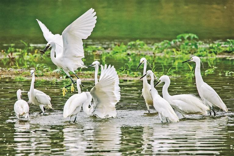 河面上的白鹭成群结队,姿态优雅。