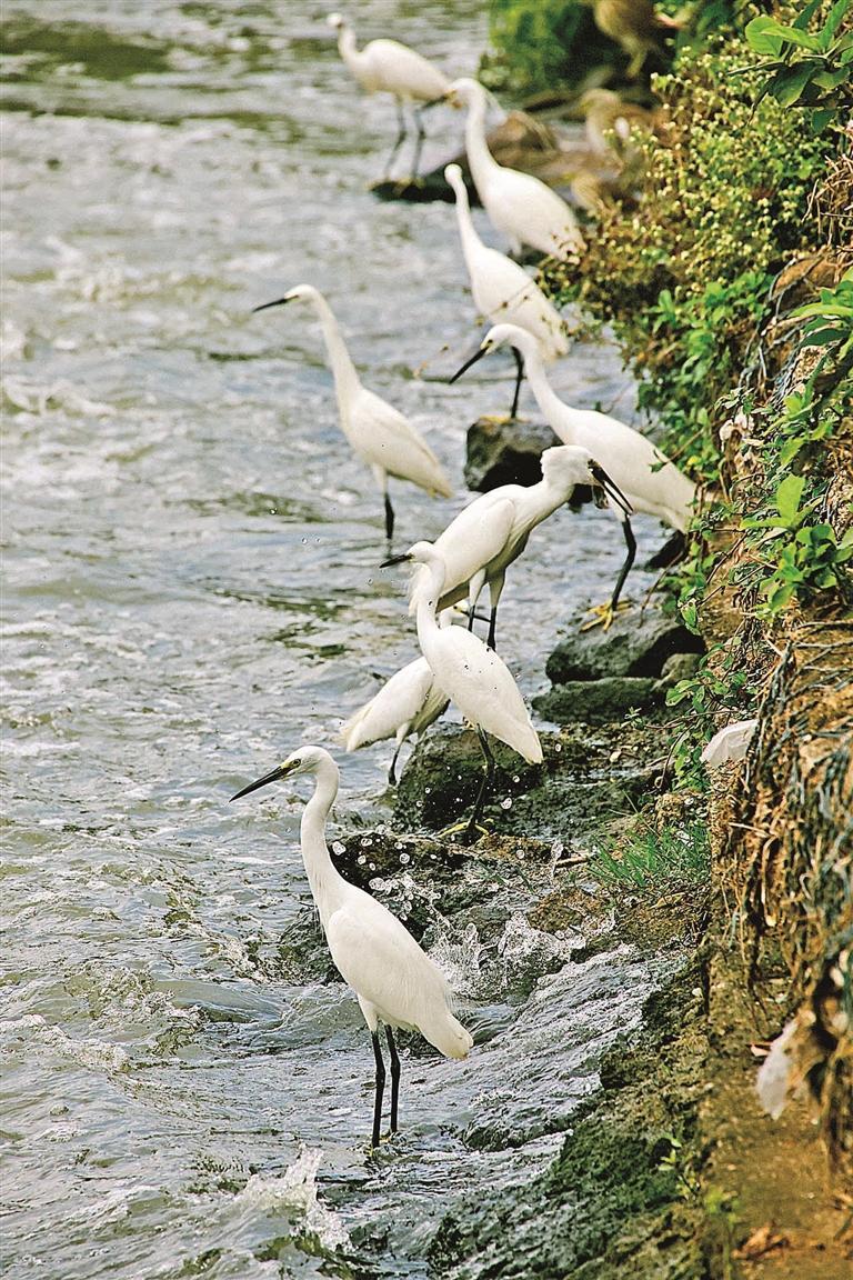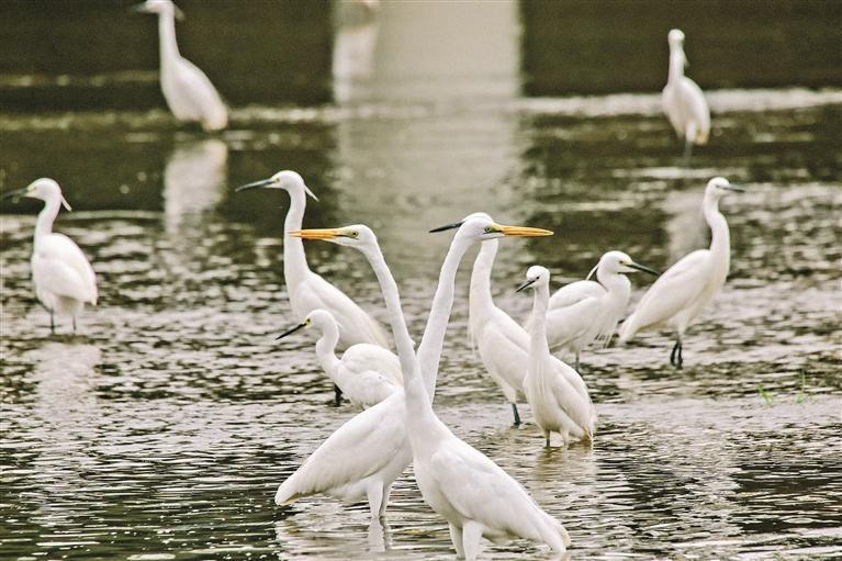 白鹭在观澜河栖息、觅食。