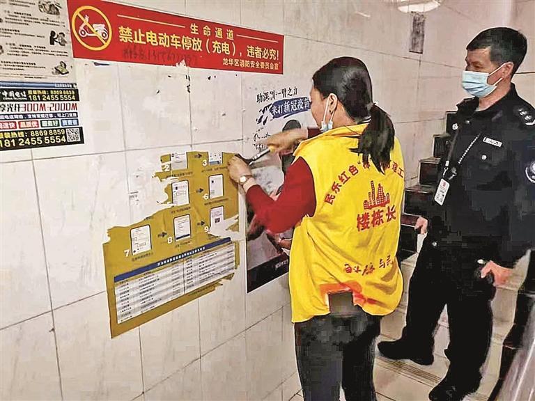 民乐社区楼长和网格员清理楼栋张贴广告。