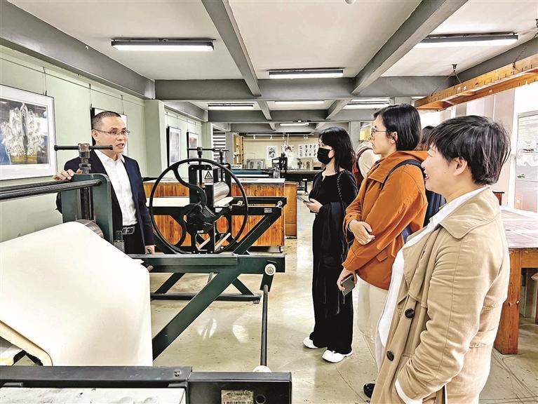 之后,媒体团还前往中国版画博物馆参观了“交互之眼——国际当代版画生态”展等展览,并在数字体验馆沉浸式互动。中国·观澜版画原创产业基地副主任赵家春介绍,2008年观澜版画原创产业基地创建并投入运营,各国艺术家络绎不绝来到这个国际艺术家村,以不同的艺术观念和精湛的版画技艺共同创造观澜版画的艺术之美。“交互之眼”展览正是基于观澜版画基地多年来在国际版画交流中积累的艺术资源和沉浸式版画研究成果,呈现当代国际版画生态,以一种平视的视角来看待他国和中国的艺术。