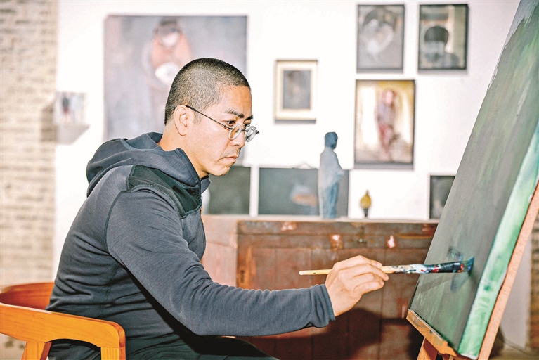 鳌湖美术馆馆长、艺术家邓春儒在工作室进行艺术创作。