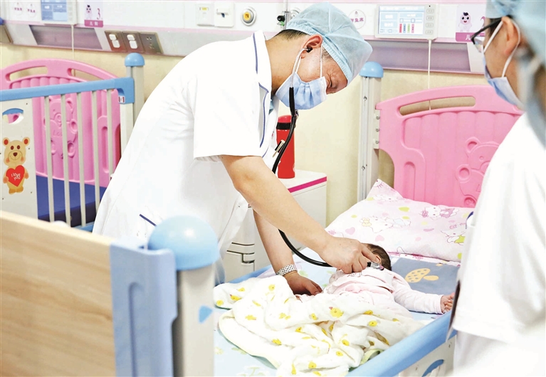 区妇幼保健院儿科医生张名贤(左)为婴儿进行身体检查。
