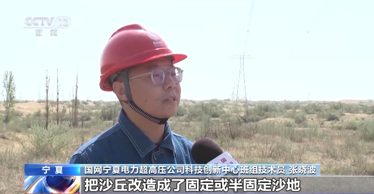 国网宁夏电力超高压公司科技创新中心班组技术员 张晓波:我们咨询了一些林业、治沙专家,通过草方格,把沙丘改造成了固定或半固定沙地,同时在草方格内播撒一些草籽,种植白柠条苗等植物,慢慢恢复了通道的植被环境。