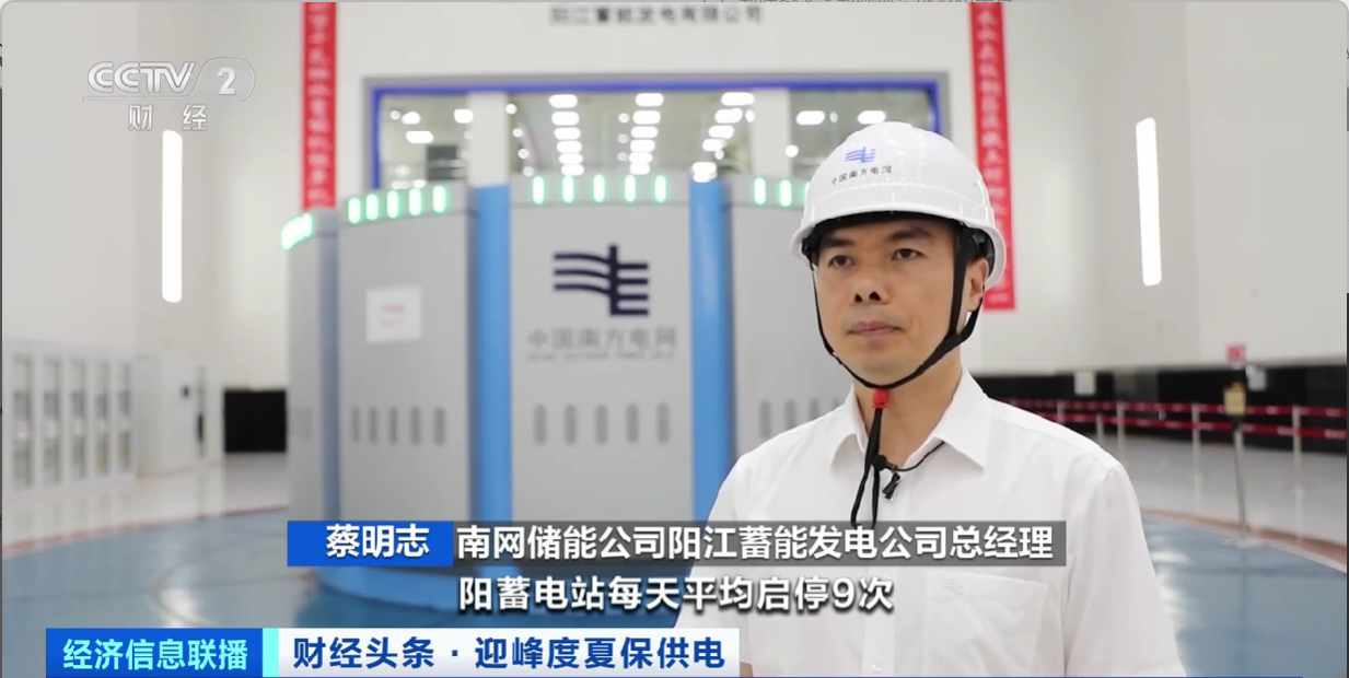 南网储能公司阳江蓄能发电公司总经理 蔡明志:迎峰度夏以来,阳蓄电站每天平均启停9次,满负荷运行超过9小时,抽水电量745万度,发电电量617万度,可满足近60万居民用户的高峰用电需求。