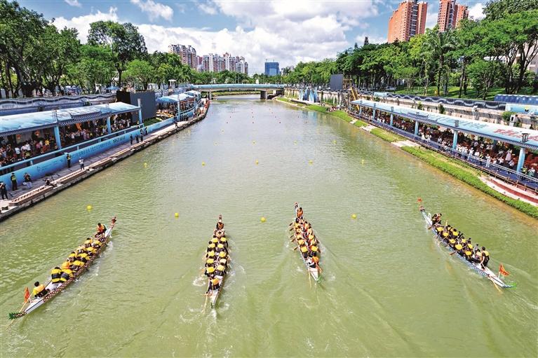 52支社区组、机关企事业组的龙舟队伍在有“深圳最美河道”之誉的观澜河上竞渡。