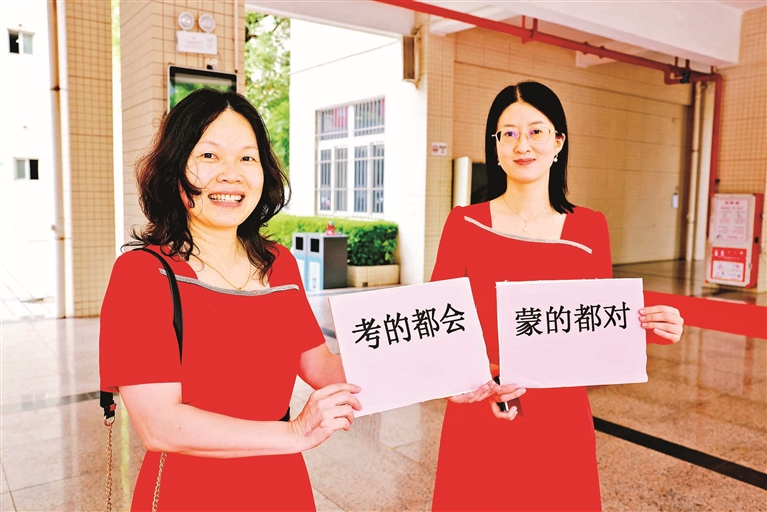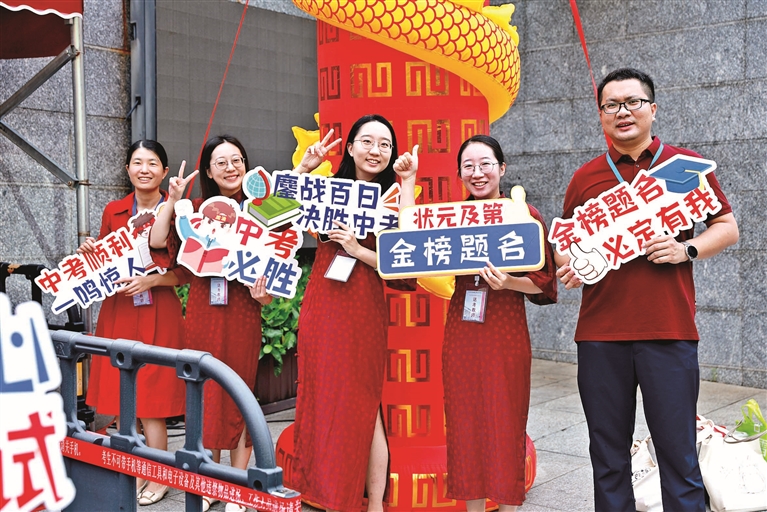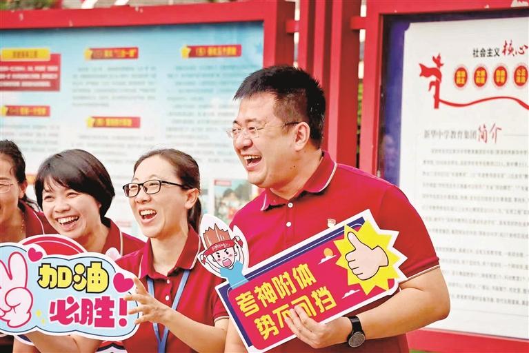 ▲新华中学教育集团,身穿红衣的送考老师,为考生加油鼓劲。