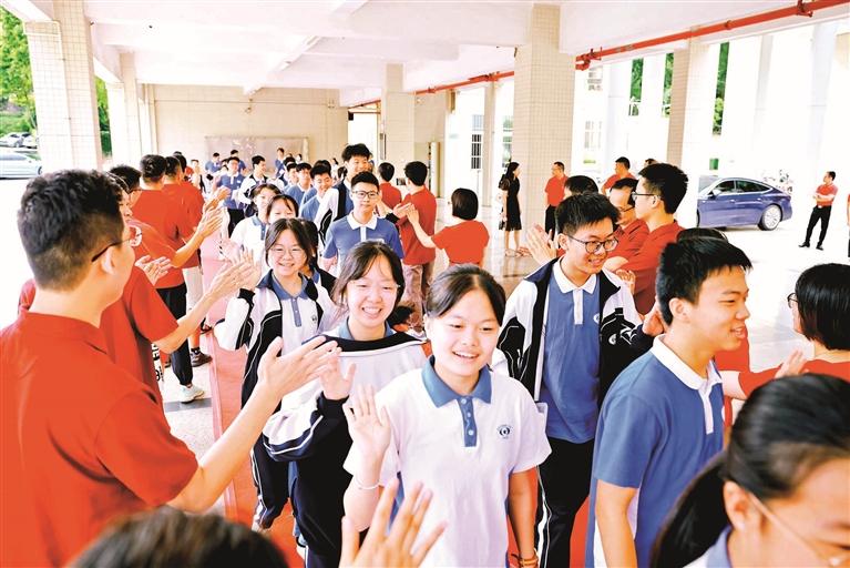 ▲观澜二中,老师们身穿红衣与考生一一击掌、拥抱,给他们加油鼓劲。