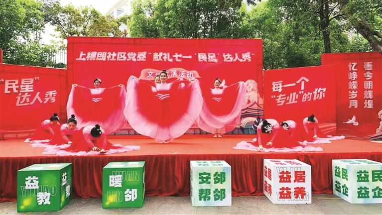 据介绍,此次活动既是一场献礼红色七月的文艺表演,又是一个社区“民星”达人的才艺展示舞台。活动共分为四个部分,分别为才艺表演、红色观影、作品展示、便民服务。才艺表演中,“民星”达人们的节目赢得现场观众的阵阵掌声。红色观影区内,社区志愿者们组织市民观看革命题材电影,带领大家一起重温红色记忆。