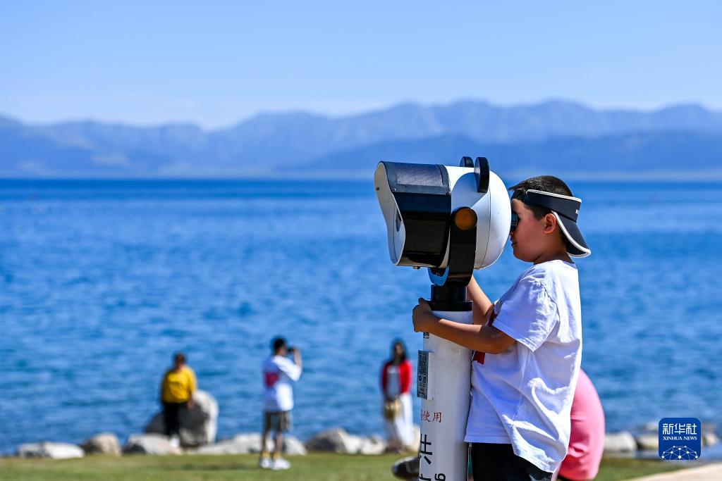 7月25日,一名小朋友在新疆赛里木湖景区使用望远镜看风景。新华社记者 丁磊 摄
