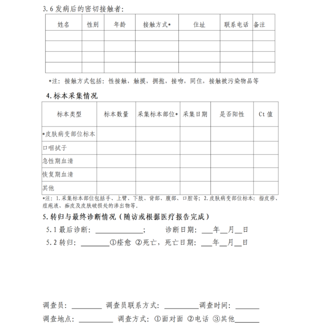 调查内容主要包括病例基本信息、发病就诊情况、临床表现、转归及实验室检测;发病前21天内与可疑感染来源的接触史、接触场所及接触方式;发病后至隔离治疗前的具体活动地点、与其有皮肤或黏膜直接接触者,以及发病前4天内与其有性接触者。