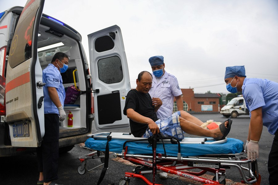 8月1日,在北京市门头沟区妙峰山镇妙峰山民族学校临时安置点,北京急救中心工作人员在转运一名受伤村民。新华社记者 鞠焕宗 摄