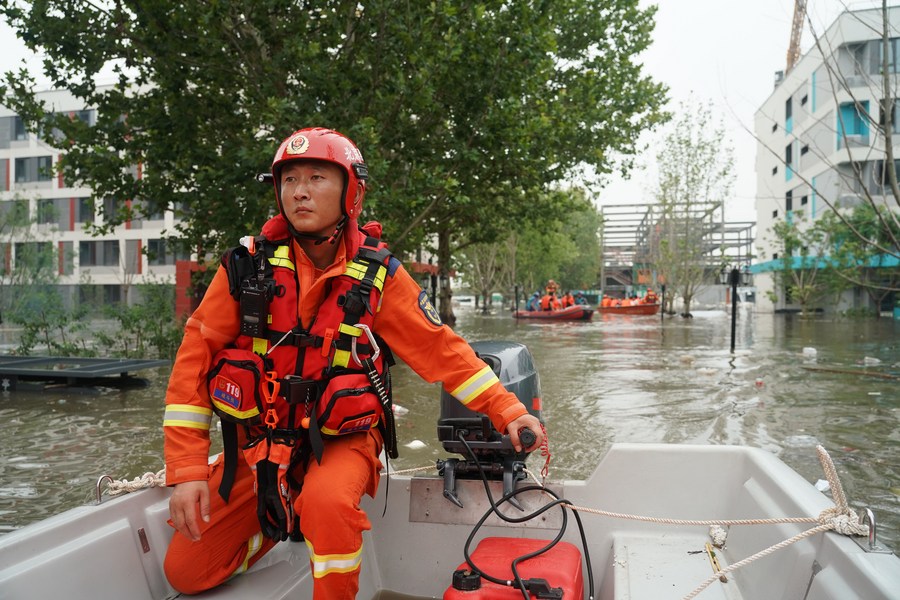 8月2日,在北京市房山区琉璃河镇平各庄村,消防员驾驶冲锋舟前往救援受灾群众。新华社记者 任超 摄