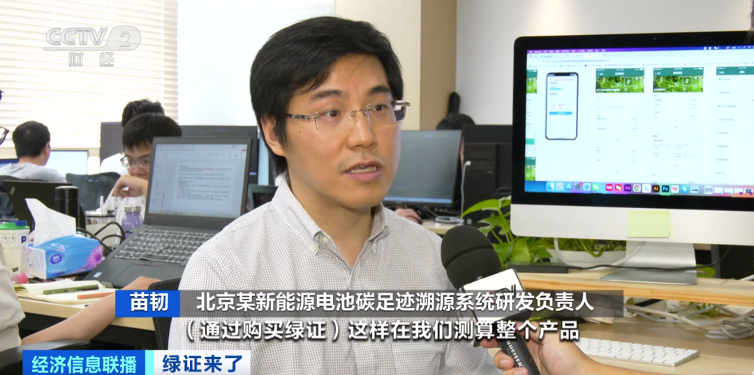 北京某新能源电池碳足迹溯源系统研发负责人 苗韧:通过购买绿证,在我们测算整个产品全生命周期的过程中,不仅是电池的组装,也包括上游的正负极材料,各环节使用绿电都可以进行有效对冲和核算。