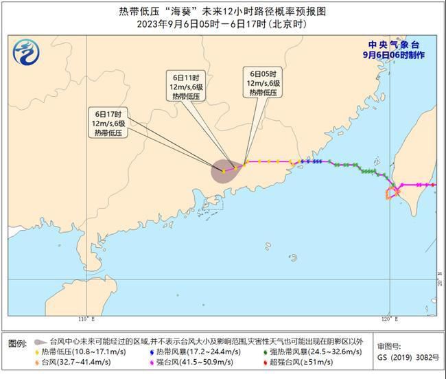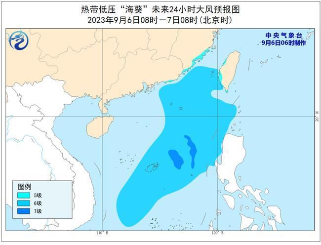 大风预报:9月6日08时至7日08时,福建东南部及沿海、广东中东部及沿海、台湾岛西部沿海、台湾海峡、南海大部将有5-7级、阵风8级的风。