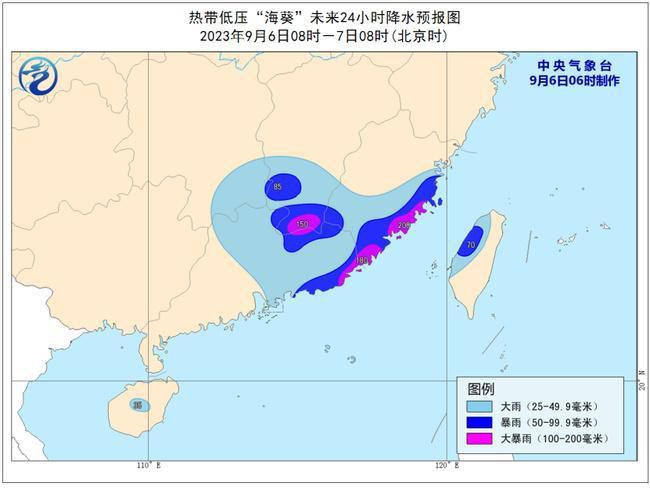 降水预报:9月6日08时至7日08时,福建大部、广东中东部、江西南部、湖南东南部、海南岛中部、台湾岛西部等地部分地区有大雨,其中,福建东部和南部、广东东北部和东南部沿海、江西南部、台湾岛西北部等地部分地区有暴雨到大暴雨(100~200毫米)。