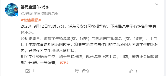 9月12日,上海浦东公安分局接报警称,下南路某中学有多名学生身体不适。
