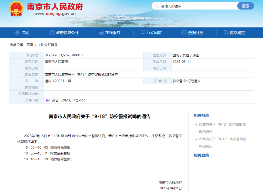 据南京市人民政府通告,9月18日上午10时至10时19分南京全市防空警报试鸣。