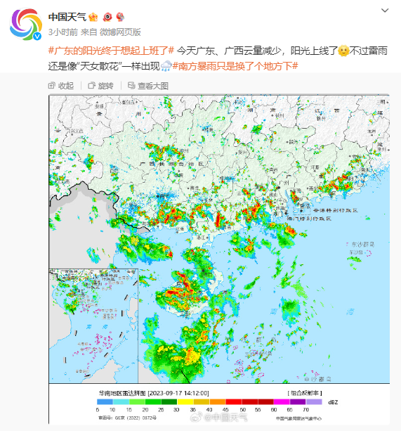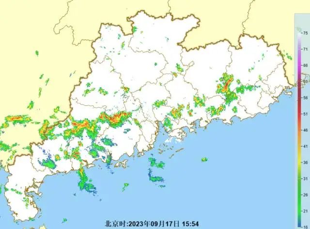 从天气雷达回波图看,截至17日15时54分,雷雨主要集中在广东西南部,包括云浮、肇庆、阳江等地雨势较大;同时,河源、梅州交界处雨势较大。