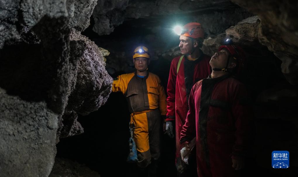 意大利专家和贵州省山地资源研究所科考队员在双河洞一处支洞中进行探索(9月24日摄)。新华社记者 陶亮 摄