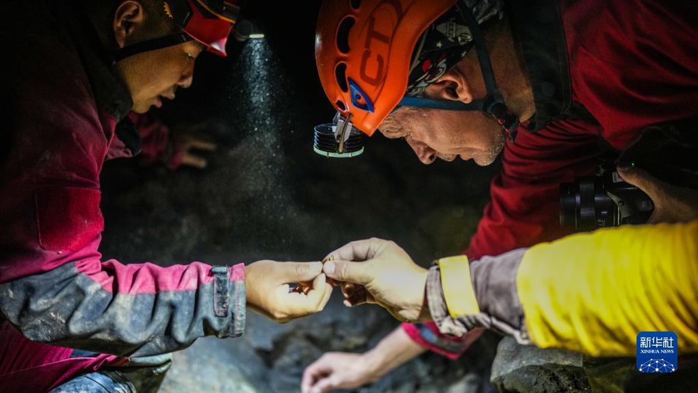 意大利专家和贵州省山地资源研究所科考队员在双河洞一处支洞中进行科考(9月24日摄)。新华社记者 陶亮 摄