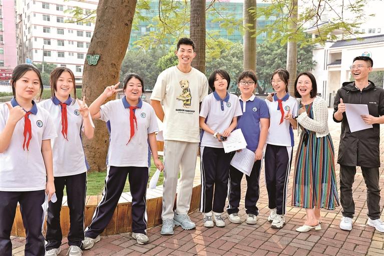 黄博凯(左四)今年4月曾返回高峰学校参与学校百年校庆课程《高峰朗读者》节目录制。(龙华区教育局供图)