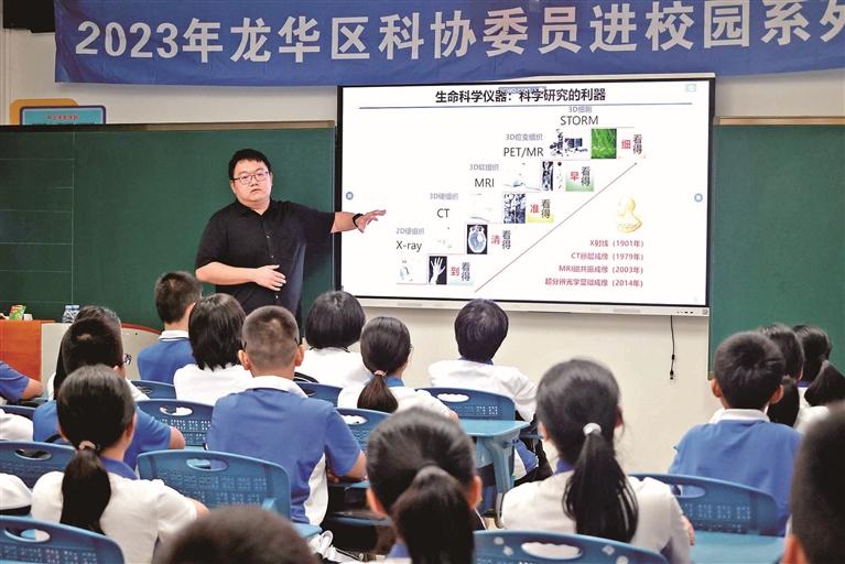 龙华区科协委员向同学们展示微观世界的奇妙之处。