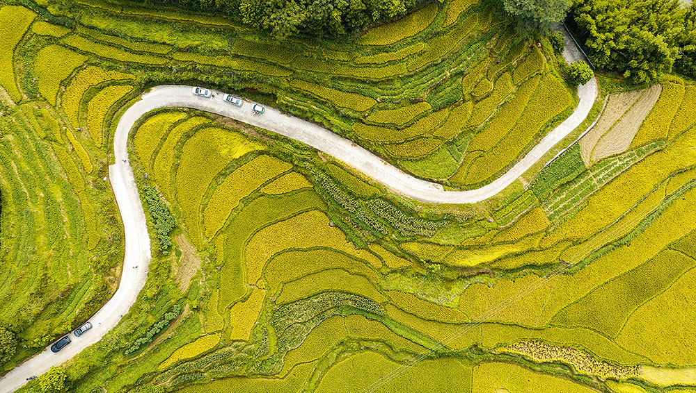 层层叠叠的梯田呈现出不同颜色,宛若色彩斑斓的“调色盘”。
