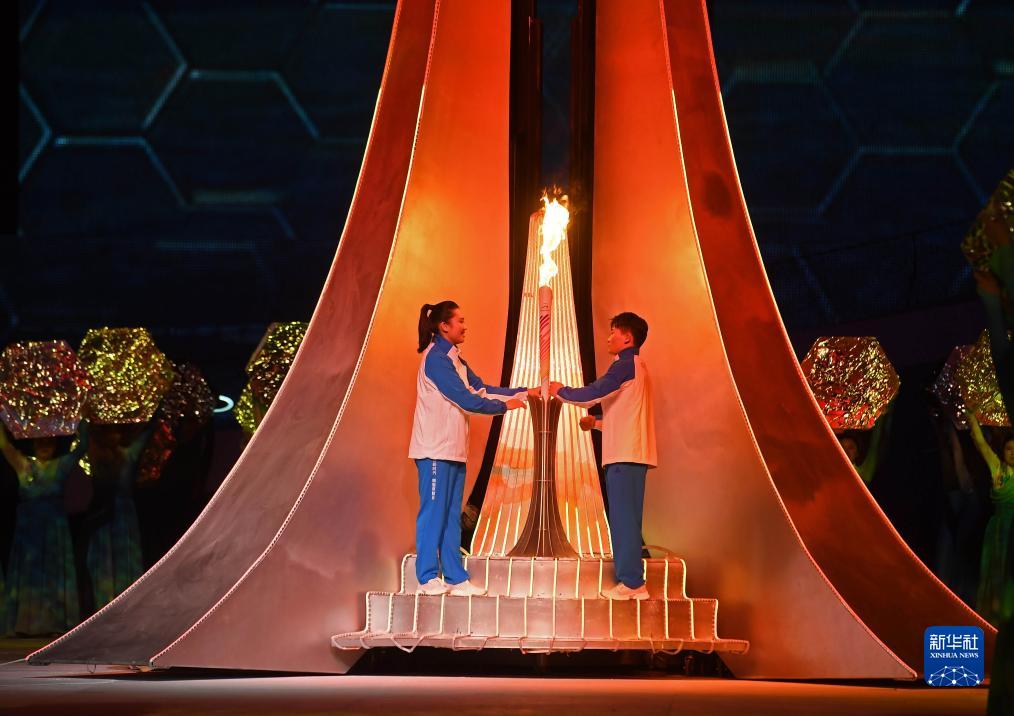 11月5日,火炬手黄雅晴(左)、兰星宇点燃主火炬。新华社记者 侯昭康 摄