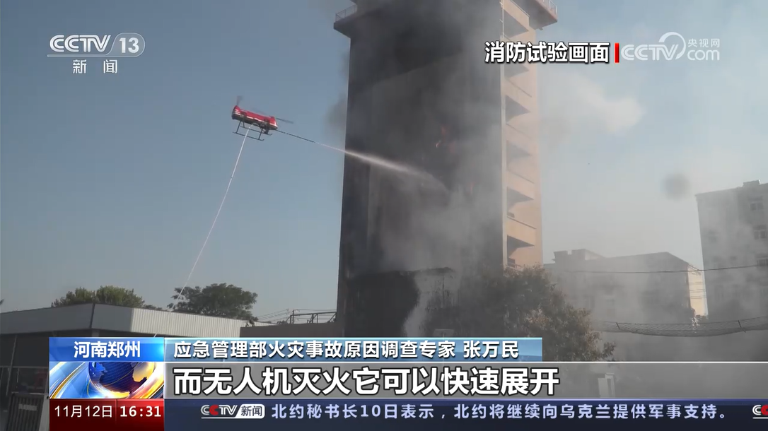 目前,一款国内自主研发的新型消防灭火无人机应运而生。与传统的高喷消防车相比,这款灭火无人机在到达火灾现场后,能快速飞至灭火的高度开展救援,使用起来更灵活机动,而且它作业的高度更高,最高能提升至1000米以上。日前,这款灭火无人机在河南郑州进行了一次真火扑救试验,这款高效的灭火无人机是如何扑救高层火灾的?