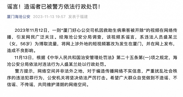 据厦门海沧公安通报,11月12日,一则“厦门好心公交司机因救助生病乘客被开除”的视频在网络传播,引发网民广泛关注。经海沧公安分局调查,该视频系谣言,系违法人员盛某兰(女,56岁)为博取流量,将网上涉外地的短视频篡改为发生在厦门,并在网上发布,造成不良影响。11月13日,根据《中华人民共和国治安管理处罚法》第二十五条第(一)项之规定,海沧公安分局依法对违法行为人盛某兰处以行政处罚。