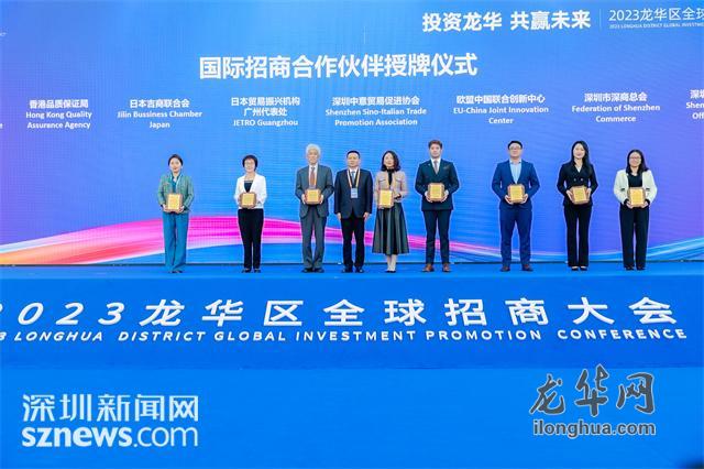 同时,为感谢广大国内外商协会、行业组织及社会各界人士对龙华区招商引资工作的鼎力支持、作出的积极贡献,大会上,龙华区分别为日本贸易振兴机构、中意商贸交流促进会、深圳市深商总会、日本吉商联合会、欧盟中国联合创新中心、深圳市外事保障中心、香港品质保证局、深圳市女企业家商会等颁发“2023龙华区全球招商大会国际招商合作伙伴”牌匾。