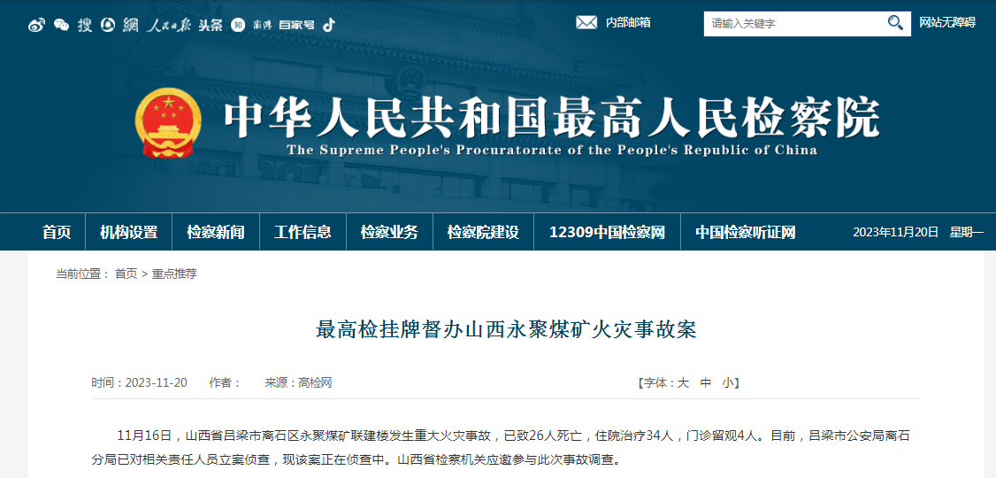 据最高人民检察院网站11月20日消息,11月16日,山西省吕梁市离石区永聚煤矿联建楼发生重大火灾事故,已致26人死亡,住院治疗34人,门诊留观4人。目前,吕梁市公安局离石分局已对相关责任人员立案侦查,现该案正在侦查中。山西省检察机关应邀参与此次事故调查。