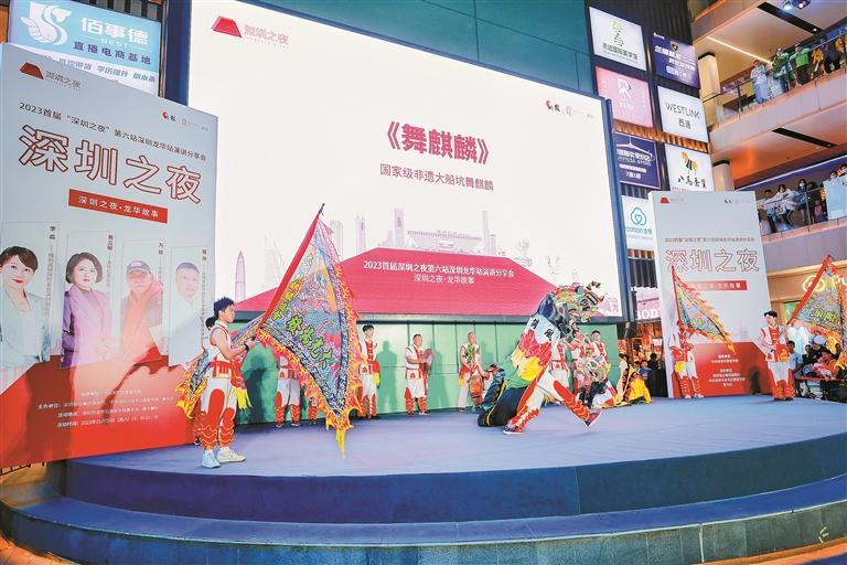 11月25日晚上,伴随着锣鼓声,由谢碧华领队的国家级非遗大船坑舞麒麟在龙华区大浪覔文化创意园精彩上演,为2023首届“深圳之夜”第六站龙华站演讲分享会正式拉开帷幕。从今年4月启航至今,巡回走过惠州、东莞、佛山、广州、珠海,“深圳之夜”终于回到深圳,第六站地点选在龙华,作为“深圳之夜”在湾区城市巡演后回到深圳主场举办的首场活动,尽显龙华区域特性、深圳城市特质。