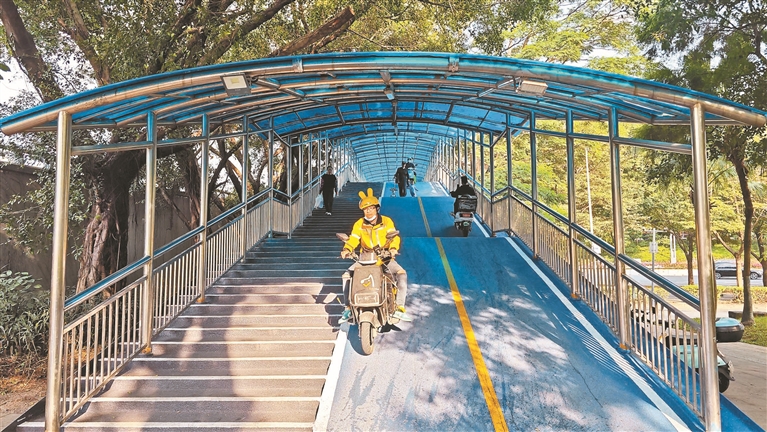 如今,在社区的大力推动下,管养单位对顶棚进行了加固处理;对天桥桥面进行了全面翻新,不仅更换了防滑材料,还拓宽了推行通道,划分了上下通行区域。居民群众纷纷表示,感谢社区工作站,天桥终于改造好了。现在上下天桥比以前轻松方便,通行更加顺畅,也更安全。外卖小哥们表示:“民乐社区居住人员多,每天跑这个片区,多的时候要经过天桥十几次,此前坡道窄,容易堵塞,容易摔倒,天桥改造后,送餐更快捷、安全了。”
