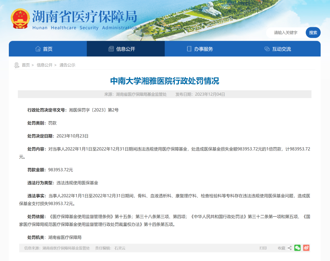 12月4日,湖南省医疗保障局网站披露中南大学湘雅医院行政处罚情况。行政处罚决定书显示,当事人2022年1月1日至2022年12月31日期间,骨科、血液透析科、康复理疗科、检查检验科等专科存在违法违规使用医保基金问题,造成医保基金支付损失983953.72元。