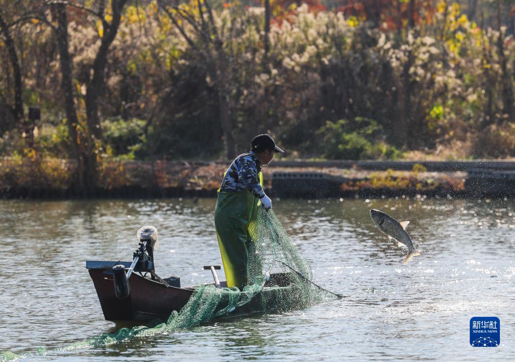 12月14日,在诸暨市白塔湖国营渔场的水域内,渔民在放网捕鱼。