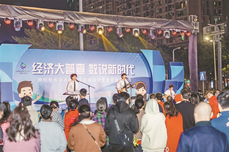 活动主舞台上,“五经普”版劲歌热舞闪亮登场。“把脉经济服务民生强,万众一心富强中国梦,再造新辉煌,数字龙华勇于担当……”乐队现场演唱经济普查改编歌曲《奔跑龙华》,用朗朗上口的旋律、浅显易懂的歌词,唱出了经济普查的意义。伴随着紧凑强劲的音乐,一众身穿蓝色马甲的舞者通过青春动感的舞姿,展现出龙华区普查员的热情与活力。现场观众在欣赏艺术表演的同时了解统计知识,深切感受到经济普查与每一位居民的生活息息相关。