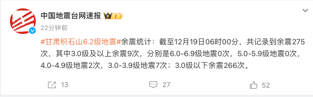 截至12月19日6时,甘肃积石山共记录到余震275次