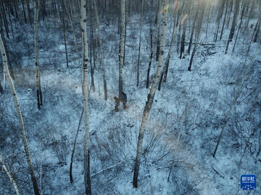12月23日,在黑龙江省漠河市,电力线路设备运维人员在北极村附近的山林中巡线(无人机照片)。新华社记者 石枫 摄