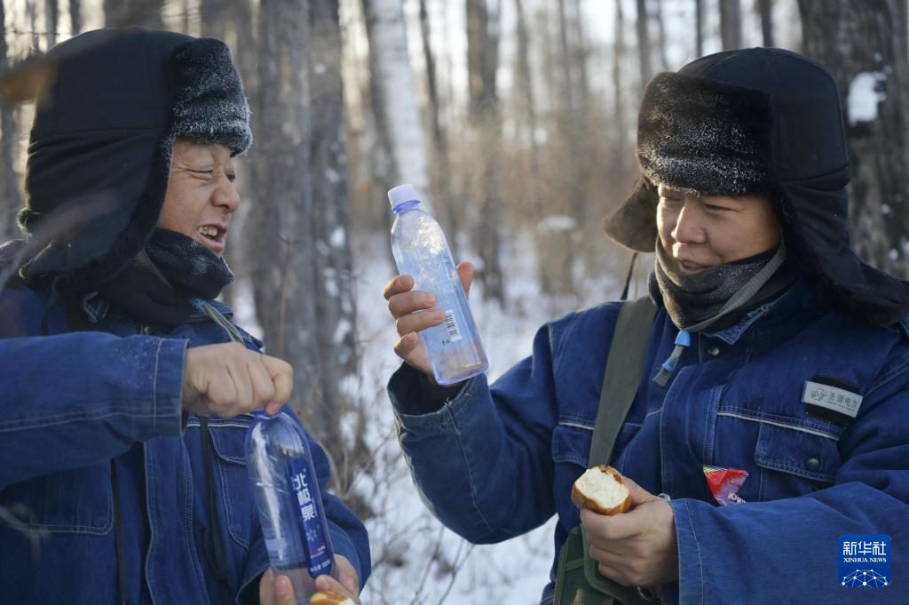 12月23日,在黑龙江省漠河市,电力线路设备运维人员在巡查间隙吃饭休息,他们喝的水已经有部分冻成冰。新华社记者 石枫 摄