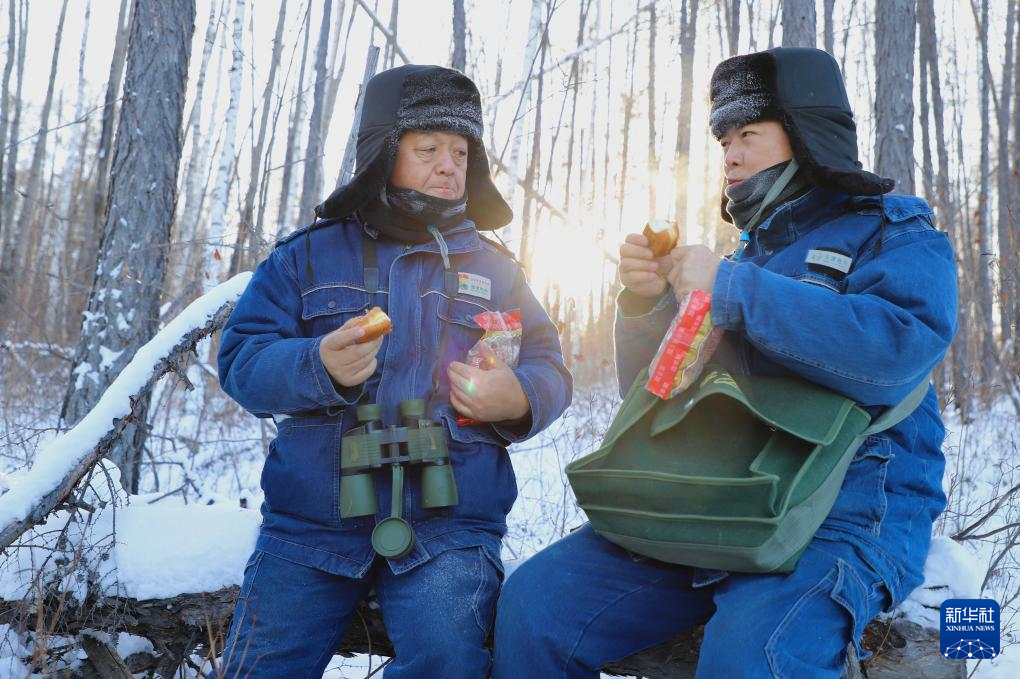 12月23日,漠河供电公司北极供电所所长吕建生(左)和同事王少亭在巡线路途中吃饭。新华社记者 徐凯鑫 摄