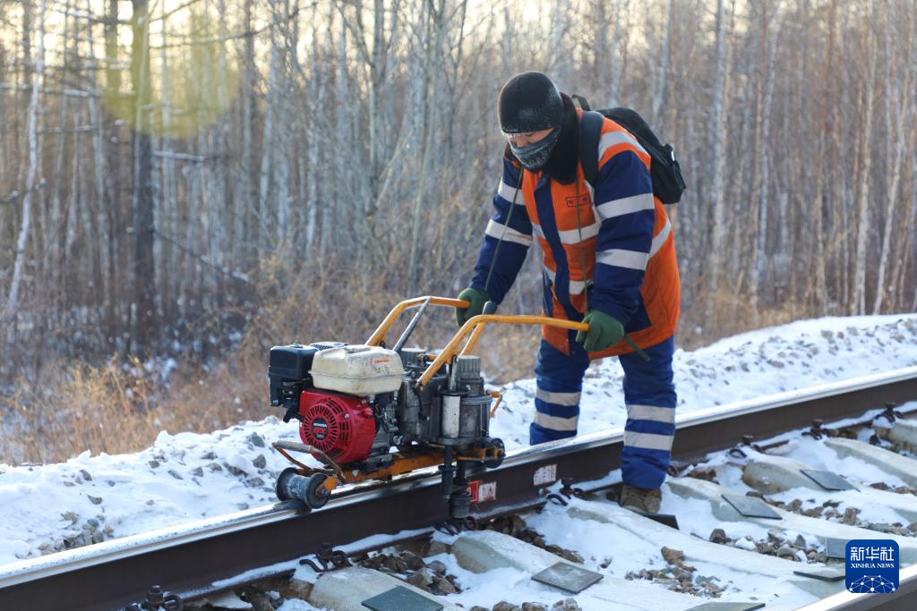 12月20日,在中国铁路哈尔滨局加格达奇工务段,漠河车间职工使用机械扳手松开螺栓以便垫入垫板。新华社记者 石枫 摄